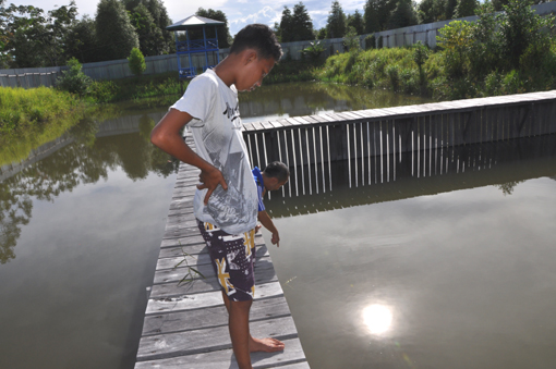 ゆったりとした飼育スタイル。(池を見つめるハリムンさんの息子)