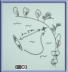 るのである。まず、カヌーに乗り込み岸辺から5m位離れた場所に、水音を立てない
