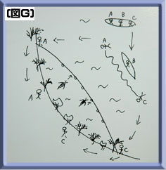 ーの影が気付かれないように近づくのである。(図C)。この間、照らした光を決して